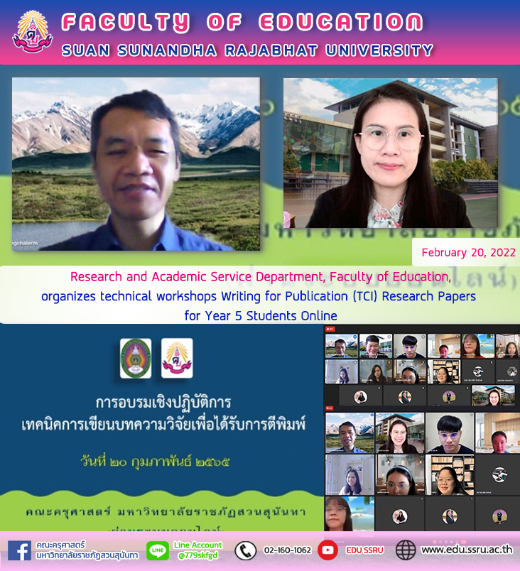 On February 20, 2022, Research and Academic Services Department, Faculty of Education, organized a workshop on Research Article Writing Techniques for Publication (TCI) for 5th year students. Associate Professor Dr. Prasart Nuengchalerm, Faculty of Education Mahasarakham University Become a lecturer In this training, there was an online training session.