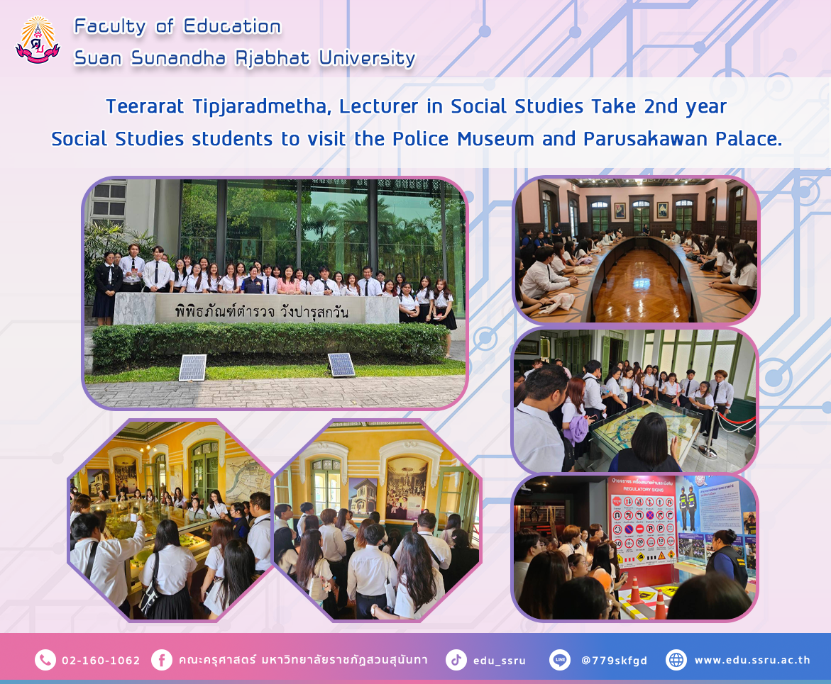 On March 19, 2024, Teerarat Tipjaradmetha, Lecturer in Social Studies, Faculty of Education, Suan Sunandha Rajabhat University, led 2nd year Social Studies students, Room 01, to visit the Police Museum, Parusakawan Palace, with a team of lecturers giving lectures. historical Take a tour of the area within the Parusakawan Palace area. and describes the development of the Thai police In this activity, students have the opportunity to study knowledge from learning sources and participate in activities that are very useful.
