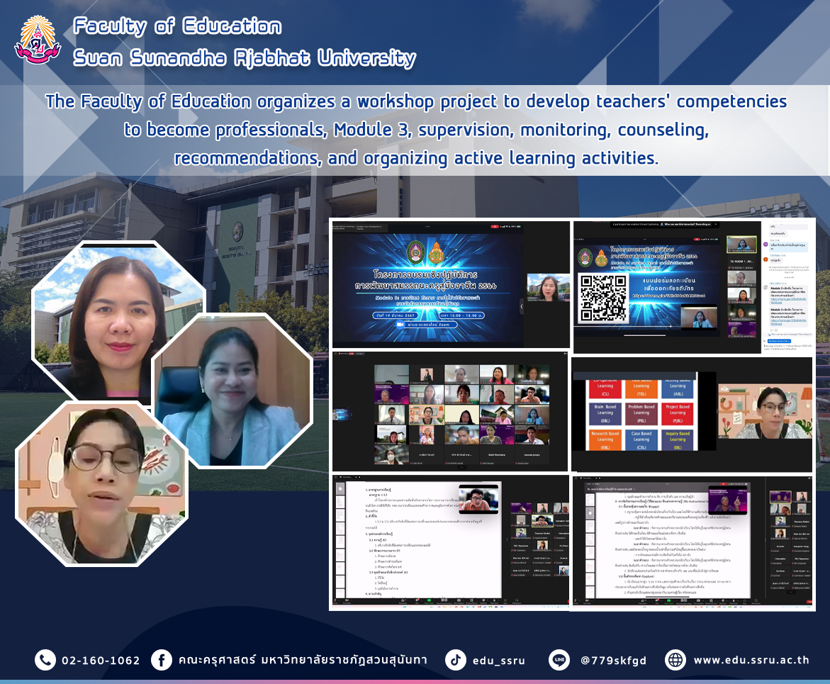 On March 19, 2024, the Faculty of Education at Suan Sunandha Rajabhat University organized a workshop project to develop teachers' competencies to become professionals: Re-skill/Up-skill Network teaching professional personnel, Faculty of Education, Suan Sunandha Rajabhat University, Module 3, supervision, monitoring, advising, recommending, and organizing active learning activities, led by Assistant Professor Dr.Tasanee Satthaphong, Deputy Dean for Academic Affairs, with Assistant Professor Dr. Kannika Piromrat, Dean of the Faculty of Education, chairing the opening of the project in online form.