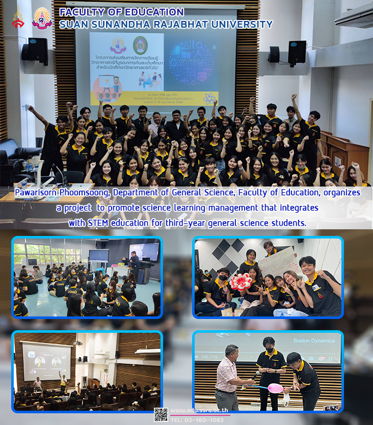 On February 18, 2023, Lecturer Pawarisorn Phoomsoong, Department of General Science, Faculty of Education, Suan Sunandha Rajabhat University, organized a science learning management project that is integrated with STEM education for general science students in the third year, which was honored by Ajarn Dr. Chanchai Chanthasen and Ajarn Thanakrit Peebkhunthod as speakers. in lectures and activities on the topics of STEM education in the 21st century and learning management based on STEM education at rooms 1136 and 1137, Faculty of Education, Suan Sunandha Rajabhat University