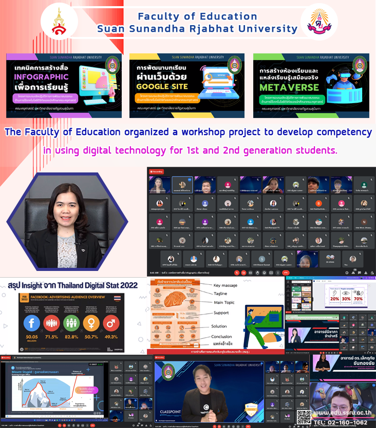 On March 18 and 19, 2023, the Faculty of Education at Suan Sunandha Rajabhat University, led by Assistant Professor Kornkamol Chuchuai, who was in charge of the project, organized a workshop to develop competency in using digital technology for students in the Faculty of Education. There are six topics in the training, as follows: 1. Creation of interactive teaching materials with Classpoint 2. Development of web-based lessons with Google Site 3. Creation of virtual classrooms and learning resources 4. Techniques for creating infographic media for learning 5. Use of Microsoft 365 for Professional Teachers and 6. Development of video and animation media for learning via online Google Meet