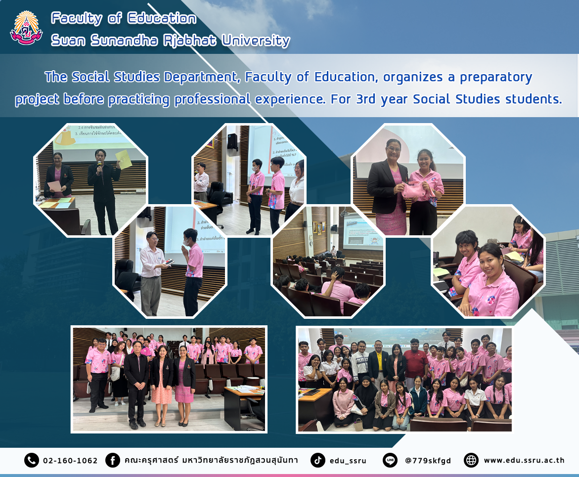 On March 30, 2024, from 8:30 a.m. to 5:00 p.m., Social Studies Department, Faculty of Education, Suan Sunandha Rajabhat University. Organize a preparation project before practicing professional experience. For third-year Social Studies students, Assistant Professor Panuwat Sivaskunraj, Head of the Teaching Profession Group, and Acharn Malai Pradabsri were lecturers, giving a lecture on the topic of emotional wellness management, depression, and guidelines for students, with Dr. Athiphan Wannasuriya as a speaker on the topic of preparing financial management for students, and alumni Mr. Rawin Warinchalanai, Teacher Siwakorn Iam-on, and Teacher Sarit Dongsing came to lecture on preparation for professional experience training and gave advice to third-year social studies students in room 1137. Faculty of Education