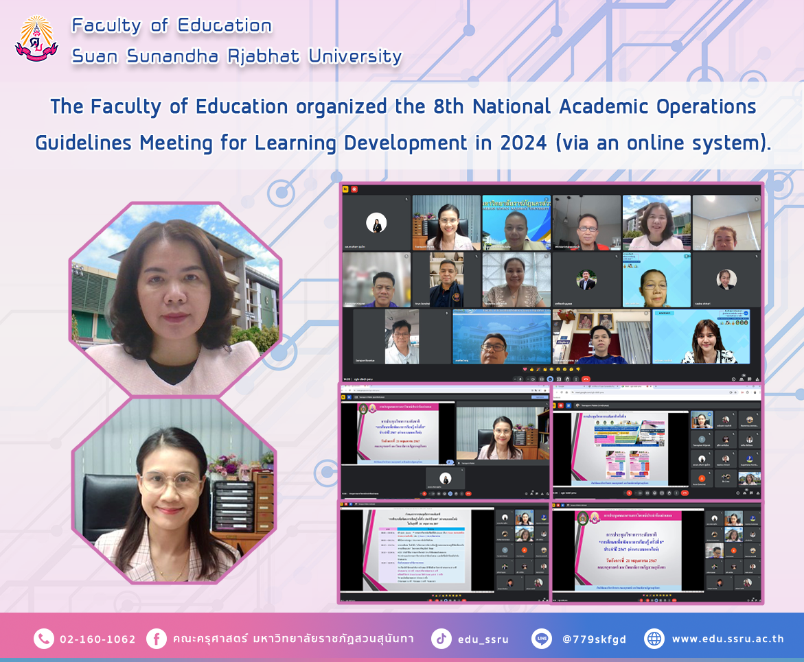 On May 21, 2024, the Faculty of Education, Suan Sunandha Rajabhat University, led by Assistant Professor Dr. Kannika Phiromrat, Dean of the Faculty of Education, and Assistant Professor Dr.Teeraporn Plailek, Deputy Dean for Research and Academic Services, organized a meeting to clarify guidelines for national academic operations, "Education for Learning Development, 8th time" for the year 2024 (via the online system).