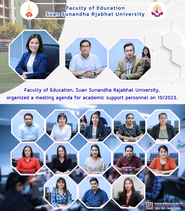 December 21, 2023, Faculty of Education, Suan Sunandha Rajabhat University, led by Assistant Professor Dr. Kannika Piromrat, Dean of the Faculty of Education. Weerapojt Ruttanawarn, Deputy Dean for Administration Academic Support Personnel Meeting No. 10/2023, will clarify work and report on monitoring various indicators of the faculty at meeting room 1124, Faculty of Education.