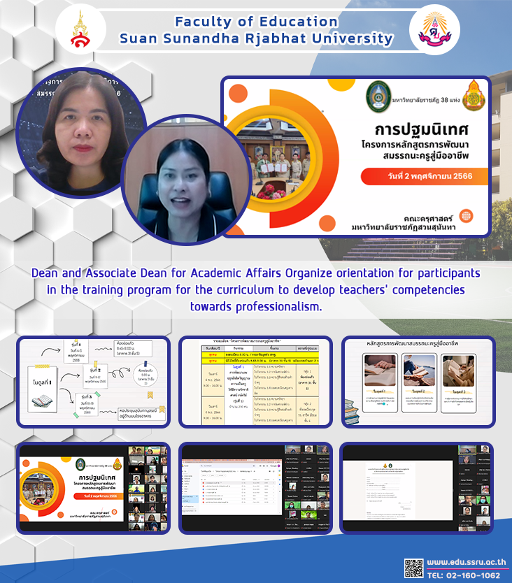 November 2, 2023, at 4:00 p.m., Faculty of Education, Suan Sunandha Rajabhat University, led by Assistant Professor Dr. Kannika Piromrat, Dean of the Faculty of Education, and Assistant Professor Dr. Tasanee Satthaphong, Deputy Dean for Academic Affairs. Organize orientation for participants in the training program for the development of teacher competency towards professionals at Suan Sunandha Rajabhat University. To clarify details and prepare before training. Via the online Zoom Meeting system