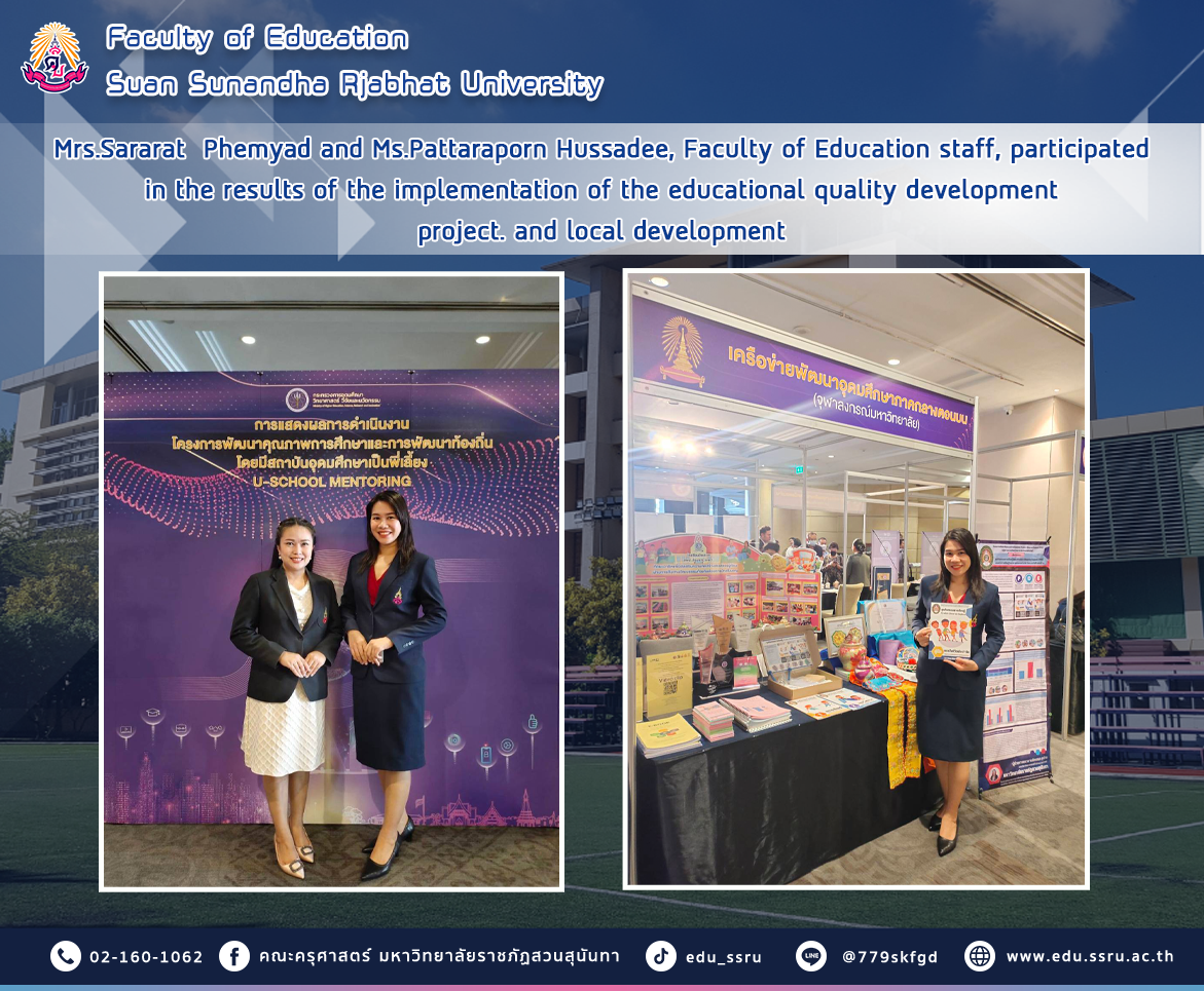 On March 22, 2024, Mrs.Sararat Phemyad, general administration officer (administrative work), and Ms.Pattaraporn Hussadee, education specialist, (Quality Assurance/Strategic Plan Monitoring) Participate in showing the results of the educational quality development project. and local development. With a higher education institution as a mentor, Ms. Supamas Issaraphakdi, Minister of Higher Education, Science, Research, and Innovation, gave a report, and General Paiboon Khumchaya, Privy Councilor, gave an opening speech at the Salon A and Salon B meeting rooms on the 2nd floor of the hotel. Visotel Bangkok