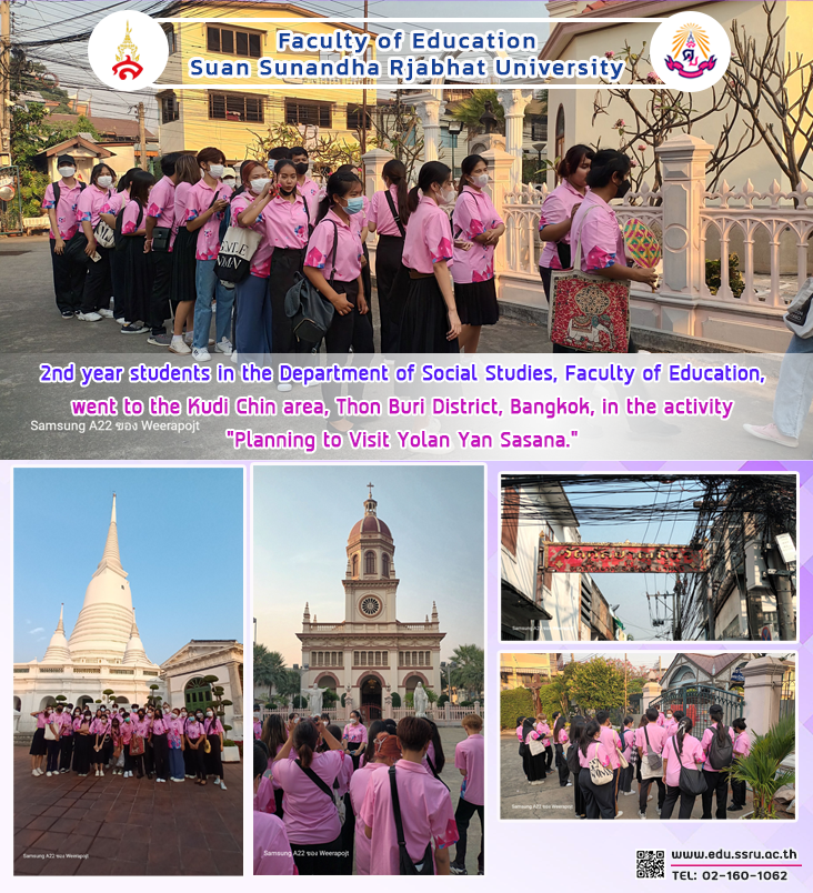 On February 2, 2023, second-year students in Social Studies at the Faculty of Education traveled to the Kudi Chin area of Bangkok's Thon Buri District to study religious sites such as Wat Prayura Wongsawat Worawihan. Santa Cruz Temple, Kudi Chin Community, Kian An Keng Shrine, Wat Kalayanamit Woramahawiharn Tonson Mosque, and Kudi Charoen Phat participated in the activity "Introspection, Visit, Yon Yan, Sasana," part of the Religious Studies course, with Weerapojt Ruttanawarn as a teacher in charge of teaching and learning.