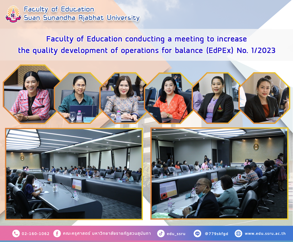 February 23, 2024, from 9:00 a.m. to 12:00 p.m., led by Assistant Professor Dr. Kannika Piromrat, Dean of the Faculty of Education. Assistant Professor Dr.Boonrudee Udomphol, Deputy Dean for Planning and Quality Assurance, and Ms.Pattaraporn Hussadee, Planning and Quality Assurance Officer I attended the meeting of the committee driving the development of educational quality for excellence (EdPEx) at Suan Sunandha Rajabhat University. Academic year 2023, No. 1/2023, at the University Council meeting room, 5th floor, Building 31