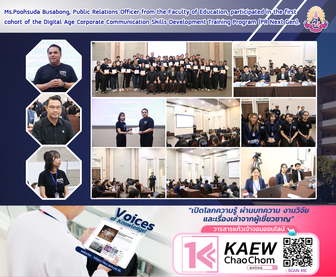 From March 18-20, 2026, Ms.Poohsuda Busabong, Public Relations Officer of the Faculty of Education, Suan Sunandha Rajabhat University, participated in the closing ceremony and certificate presentation for graduates of the Digital Age Corporate Communication Capacity Building (PR Next Gen) training course. The ceremony was held at the Jamjuri Meeting Room, Kaew Chao Chom Hotel, Suan Sunandha Rajabhat University, Nakhon Pathom Campus. Associate Professor Dr. Chutikarn Sriwiboon, President of Suan Sunandha Rajabhat University, assigned Associate Professor Dr. Komsan Sommanawat, Vice President for Administration, to preside over the closing ceremony. The event was also honored by the presence of distinguished judges: Assistant Professor Dr. Somsak Klaysang, Vice President for Student Affairs; Mr. Tonfon Sapniran, Assistant President for International Relations; Assistant Professor Dr. Narong Anurak, lecturer in content creation and news reporting; and Mr. Sakrapee Wadishirisak, corporate communication consultant. The morning session consisted of presentations of the completed training programs. A certificate presentation ceremony was also held for those who successfully completed the training. This training is another important activity in developing the potential of personnel at Suan Sunandha Rajabhat University. The knowledge and skills gained will be applied to develop the university's organizational communication work more effectively and for the benefit of the organization.
