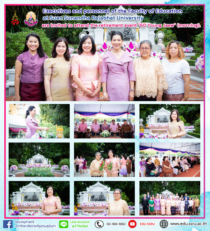 On September 23, 2022, the Faculty of Education, Suan Sunandha Rajabhat University, led by Assistant Professor Dr. Kannikar Piromrat, Dean of the Faculty of Education, and Associate Professor Dr. Tasanee Satthaphong, Associate Dean for Academic Affairs, attended the retirement event "60 Young Chaew" (in the morning) with Associate Professor Dr. Chutikarn Sriwiboon, President of Suan Sunandha Rajabhat University, presided over the lighting of incense sticks, candles, little gold ornaments, and placing garlands. Phra Borommaratchathewi for auspiciousness at the royal monument of Her Majesty Queen Sunandha Kumariratana Phra Borommaratchathewi