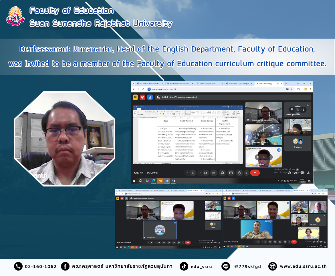 On March 24, 2024, Dr.Thassanant Unnanantn, Head of the English Department, Faculty of Education, Suan Sunandha Rajabhat University, was invited by the Faculty of Liberal Arts, Rajapruek University, to be a member of the Faculty of Education curriculum critique committee via an online system, in collaboration with qualified persons from various institutions.