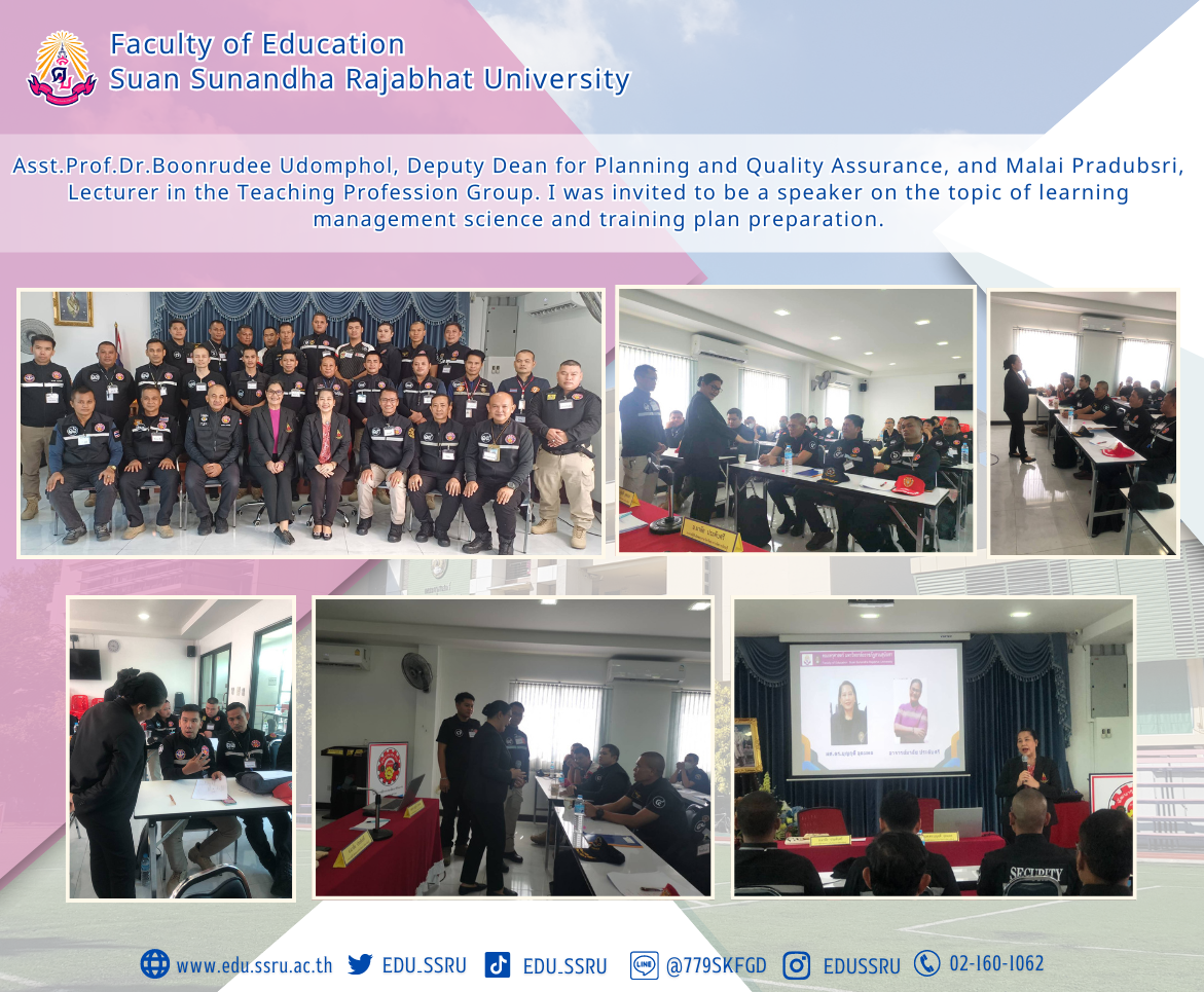On Tuesday, April 23, 2024, Assistant Professor Dr.Boonrudee Udomphol, Deputy Dean for Planning and Quality Assurance, and Malai Pradubsri, Lecturer in the Teaching Profession Group, Faculty of Education, Suan Sunandha Rajabhat University, were invited to be a lecturer in the Security Professional Development Group. Training project for the "Security Trainer" course on learning management science and training plan preparation at the "PTG" training center, Bang Bua Thong District, Nonthaburi Province.