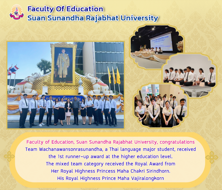 The Faculty of Education, Suan Sunandha Rajabhat University, would like to congratulate Team Wachanawansonrasunandha, a student of the Thai Language Department at the Faculty of Education, Suan Sunandha Rajabhat University. They won the 1st runner-up award at the higher education level in the mixed team category and received the Her Royal Highness Princess Maha Chakri Sirindhorn Award. Princess Maha Chakri Sirindhorn from the Oh Ae Wihan Rai Chanting Contest Fiscal Year 2024 (Final Round), with the teachers controlling the team being Teacher Thidadao Dejsri and Teacher Supakthat Suthanapinyo.
