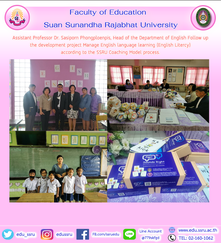 September 24, 2020, Assistant Professor Dr. Sasiporn Pongploenpis, Head of English Language Program, Faculty of Education, Suan Sunandha Rajabhat University Following up on the project to develop English language learning management (English Litercy) according to the SSRU Coaching Model process, under the project of quality development of education and local development with higher education institutions as mentors of the Upper Central Higher Education Development Network. Fiscal Year 2020 at Inthasak Suksalai School (Ban Yang), Thung Kraphang Mo Sub-district Kamphaeng Saen District Nakhon Pathom Province