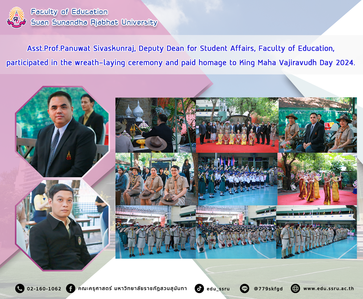 On November 25, 2024, Assistant Professor Panuwat Sivaskunraj, Deputy Dean for Student Affairs, Faculty of Education, Suan Sunandha Rajabhat University, joined the wreath-laying ceremony and offered a royal salute on the occasion of Maha Vajiravudh Day, Academic Year 2024, on the anniversary of the death of His Majesty King Rama VI, the founder of the Thai Scouts. Asst. Prof. Dr. Komsan Somanawat, Vice President for Administration, presided over the wreath-laying ceremony and offered a royal salute, along with the university executives and executives of Suan Sunandha Rajabhat University Demonstration School at the King Rama VI Monument, Suan Sunandha Rajabhat University Demonstration School.