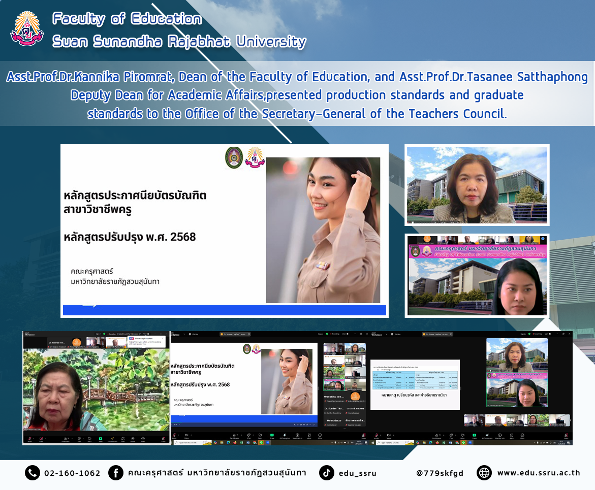 On February 25, 2025, led by Assistant Professor Dr. Kannika Phiromrat, Dean of the Faculty of Education, and Assistant Professor Dr.Tasanee Satthaphong, Deputy Dean for Academic Affairs, Faculty of Education, Suan Sunandha Rajabhat University, as representatives of the institution responsible for the Graduate Diploma Program in Professional Teaching, the revised curriculum 2025 of the Faculty of Education, Suan Sunandha Rajabhat University, presented production standards and graduate standards to the Teachers Council Secretariat.