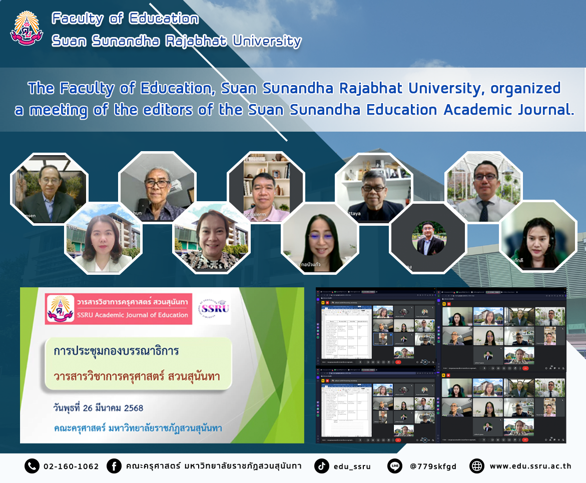On March 25, 2024, the Faculty of Education, Suan Sunandha Rajabhat University, led by Assistant Professor Dr. Kannika Phiromrat, Dean of the Faculty of Education, and Dr. Duangkamol Chongcharoen, Deputy Dean for Research and Academic Services, organized a meeting of the editorial board of the Suan Sunandha Education Academic Journal via an online system.