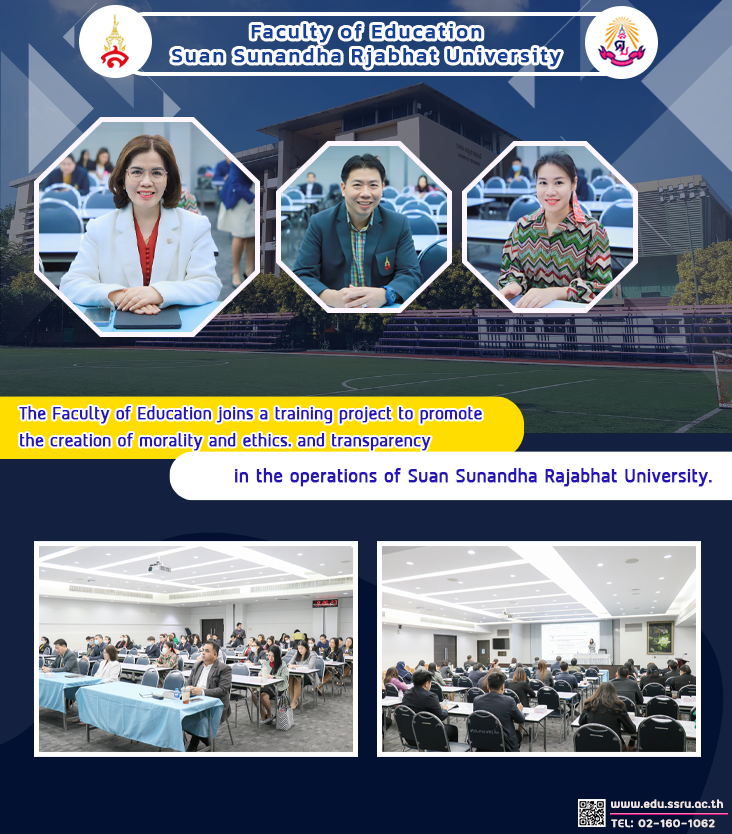 On December 25, 2023, led by Assistant Professor Dr. Kannika Piromrat, Dean of the Faculty of Education. Assistant Professor Dr. Tanawat Srisiriwat and Mrs.Sararat Phemyad joined the training project to promote morality, ethics, and transparency. In the operations of Suan Sunandha Rajabhat University, Integrity and Transparency Assessment (ITA), chaired by Assistant Professor Dr. Khomsan Somanawat, Vice President for Administration, and honored by Miss Jirapan Chan Wichian, served as a lecturer in training at the Chokaew conference room, 5th floor, Building 31.