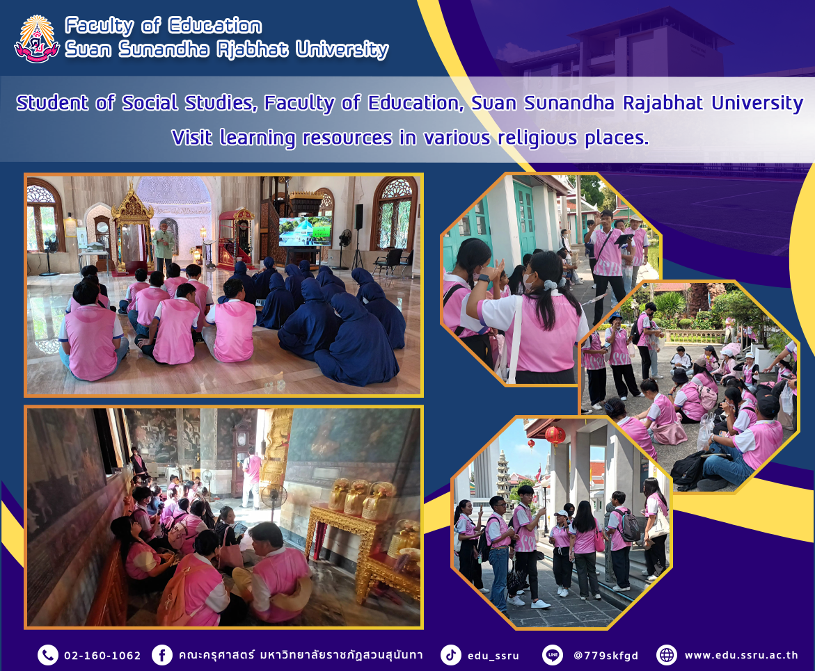 On February 23, 2024, second-year students in Group 02, Social Studies Department, Faculty of Education, Suan Sunandha Rajabhat University, will join in learning about the history, importance, background, and multicultural diversity. Passing through various religious places, including Brahman temples at Wat Suthat Thepararam Ratchawora Mahawihan Wat Prayurawongsawat Worawihan Wat Kalayanamit Woramahaviharn Kian An Keng Shrine Santa Cruz Temple, Tonson Mosque, and Kudi Charoenpat Weerapojt Ruttanawarn joined in to lecture and give knowledge.