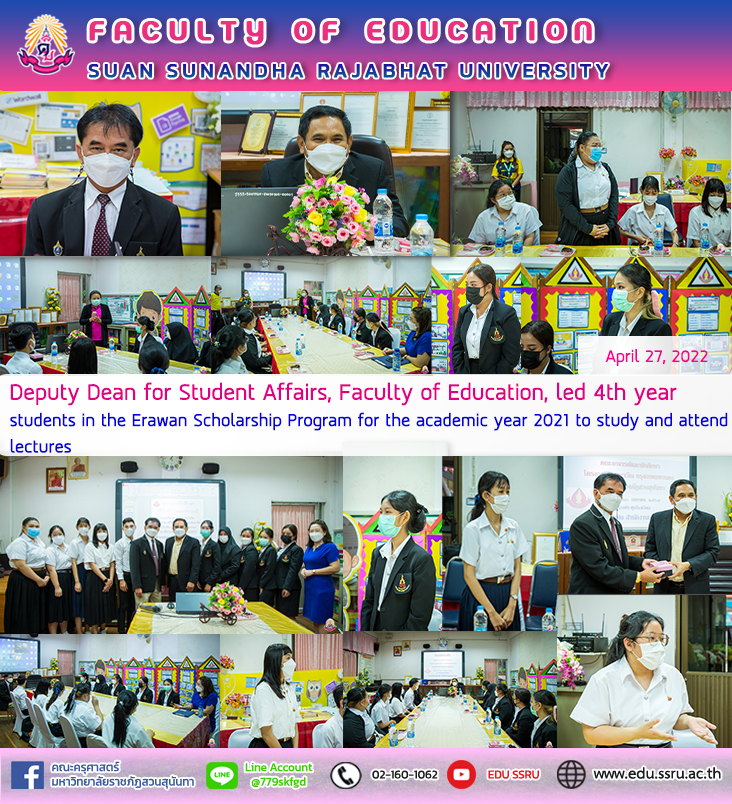 Assistant Professor Songkran Khuntiptong, Associate Dean for Student Affairs, Faculty of Education, led 4th year students in the Erawan Scholarship Program for the academic year 2021 to study and attend a lecture entitled "Roles and Duties of being a teacher under the Bangkok Metropolitan Administration and teacher performance in schools affiliated with Bangkok" was honored by Mr. Suriya Lunhong, Director of Rajabopit School Become a speaker to convey knowledge and give a lecture on April 26, 2022