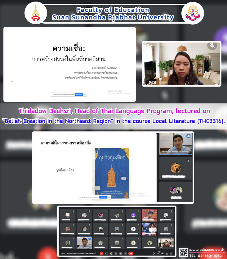 On January 27, 2023, Thidadow Dechsri, Head of Thai Language Program, lectured in the course Local Literature (THC3316) for 3rd year Thai language students on the topic of "Belief: Creation in the Isan Region." Rajamangala University of Technology Isan Khon Kaen Campus Faculty of Industrial Education Participate in online lectures through Google Meet by becoming a speaker.