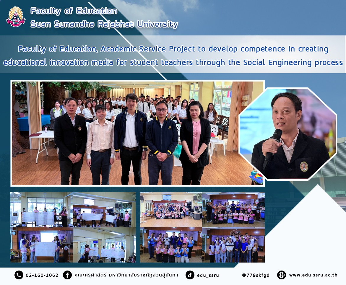 On 22-23 February 2025, the Faculty of Education, Suan Sunandha Rajabhat University, organized the project to develop educational innovators for local development using competency as a base for fiscal year 2025. Sub-project: Academic service project to develop competency in creating educational innovation media for student teachers by the process of social engineering for students in the Thai language program, the mathematics program, and the early childhood education program. Assistant Professor Panuwat Sivaskunraj, Deputy Dean for Student Affairs, gave an opening speech for the project, and Assistant Professor Narongrit Laphan and Assistant Professor Dr. Sutat Kamani were speakers.