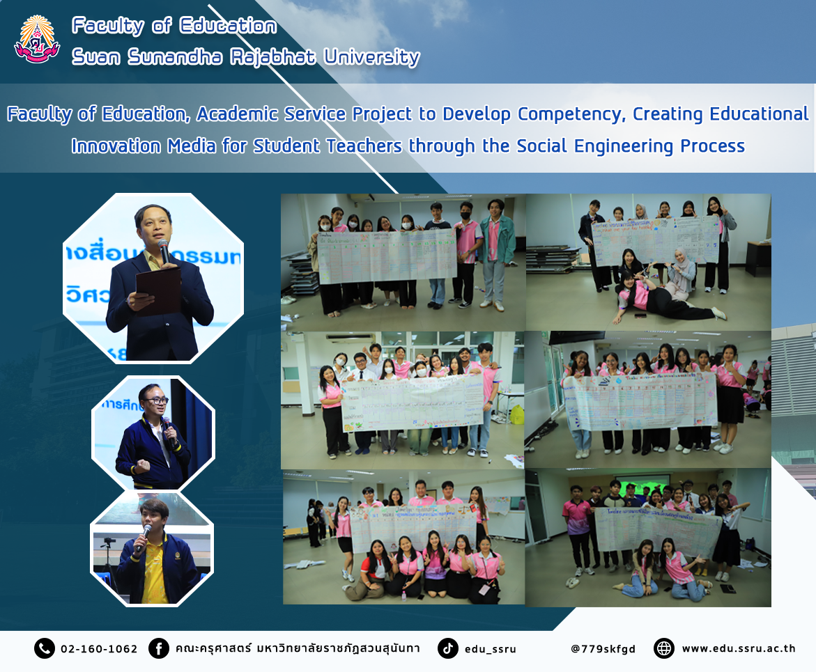 On 24-25 February 2025, the Faculty of Education, Suan Sunandha Rajabhat University, organized the project to develop educational innovators for local development using competency as a base for fiscal year 2025. Sub-project: Academic service project to develop competency in creating educational innovation media for student teachers by the process of social engineering for students in the English program, the General Science program, the Social Studies program, and the Digital Technology for Education program. Assistant Professor Panuwat Sivaskunraj, Deputy Dean for Student Affairs, gave an opening speech for the project, and Assistant Professor Narongrit Laphan and Assistant Professor Dr. Sutat Kamani were speakers.