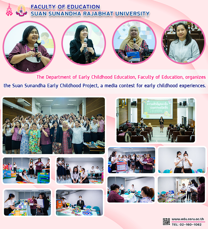 On March 26, 2023, the Department of Early Childhood Education, Faculty of Education, Suan Sunandha Rajabhat University, organized an early childhood project, Suan Sunandha Academic, organized a media contest, and organized an early childhood experience. There were students who were interested in sending media to participate in all 25 pieces from early childhood education students, 1st year through 5th year, in classrooms 1131, 1132, and 1137.