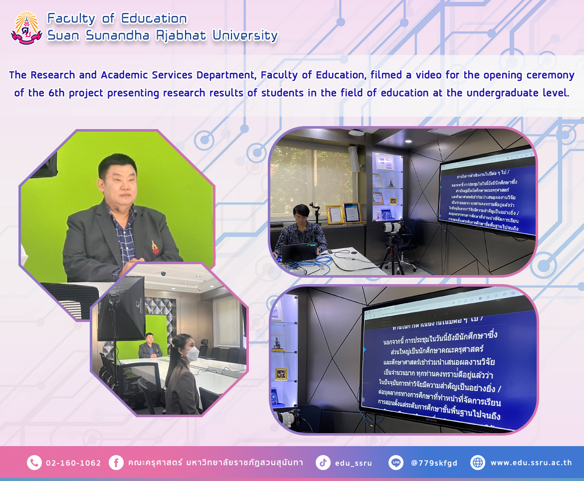 February 28, 2024, Research and Academic Services Department, Faculty of Education, and the Office of Academic Resources and Information Technology, Suan Sunandha Rajabhat University Proceed with the video recording. Associate Professor Dr. Bundit Pungnirund, Vice President for Research and Development At the opening of the national academic conference Presentation of research results of students in the field of education at the undergraduate level, No. 6, organized by the Faculty of Education at Suan Sunandha Rajabhat University, together with the network of all three co-hosting institutions, in the meeting room of the Office of Academic Resources and Information Technology,.