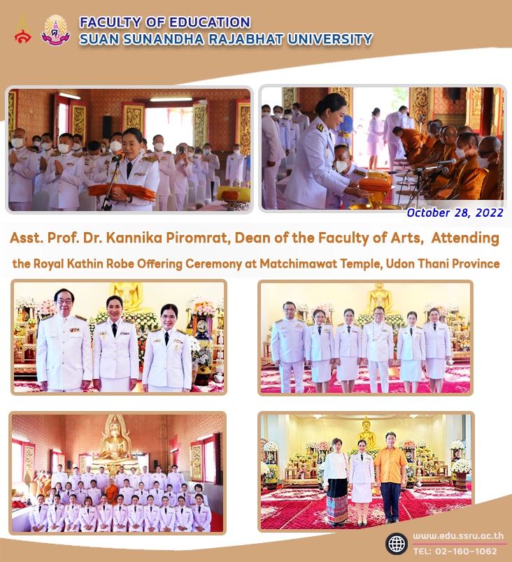 Friday October 28, 2022 Assistant Professor Dr. Kannika Piromrat, Dean of the Faculty of Education Suan Sunandha Rajabhat University Attending the Royal Kathin Robe Offering Ceremony for the year 2022 with Associate Professor Dr. Chutikarn Sriwiboon, President of Suan Sunandha Rajabhat University presided over the ceremony, which His Majesty King Bhumibol Adulyadej His Majesty King Rama 10 was graciously pleased to His Majesty bestowed the Kathin Robe to Suan Sunandha Rajabhat University to be consecrated at the Matchimawat Temple (Phra Aram Luang), Udon Thani Province