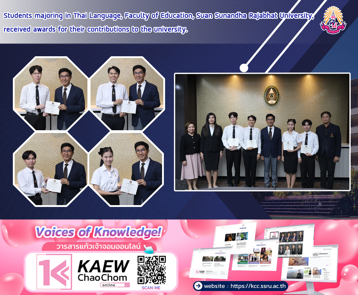 On January 28, 2026, students from the Thai Language Program, Faculty of Education, Suan Sunandha Rajabhat University, received awards for their contributions to the university. The students, Mr. Natthakorn Sriprachan (4th year), Mr. Seksan Chanphen (4th year), Ms. Kanyakorn Yanyong (2nd year), and Mr. Bodin Inpanya (2nd year), won first place in two national competitions: first place in the team competition for poetry and recitation at the Mahidol University event, part of the Education-Arts & SDGs fair, and first place in the national impromptu poetry competition on National Thai Language Day, organized by Mahamakut Buddhist University, Isan Campus, Khon Kaen Province, in collaboration with the Sunthorn Phu Studies Fund. Associate Professor Dr. Luedech Girdwichai, President of the University Council, presented the certificates at the University Council Meeting Room, 5th floor, Building 31, Suan Sunandha Rajabhat University.