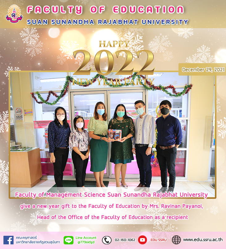 December 29, 2021 Faculty of Management Science Suan Sunandha Rajabhat University give a new year gift to the Faculty of Education Was honored by Mrs. Ravinan Payanoi, Head of the Office of the Faculty of Education as a recipient