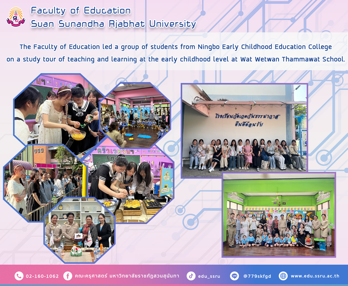 On January 29, 2024, the Faculty of Education at Suan Sunandha Rajabhat University, led by Assistant Professor Sirimanee Banjong and Disira Phangsanga, lecturers in the Early Childhood Education Department, I brought a group of 12 students from Ningbo Early Childhood Education College, China, and two Chinese teachers to study the teaching and learning at the early childhood level at Wat Wetwan Thammawat School.