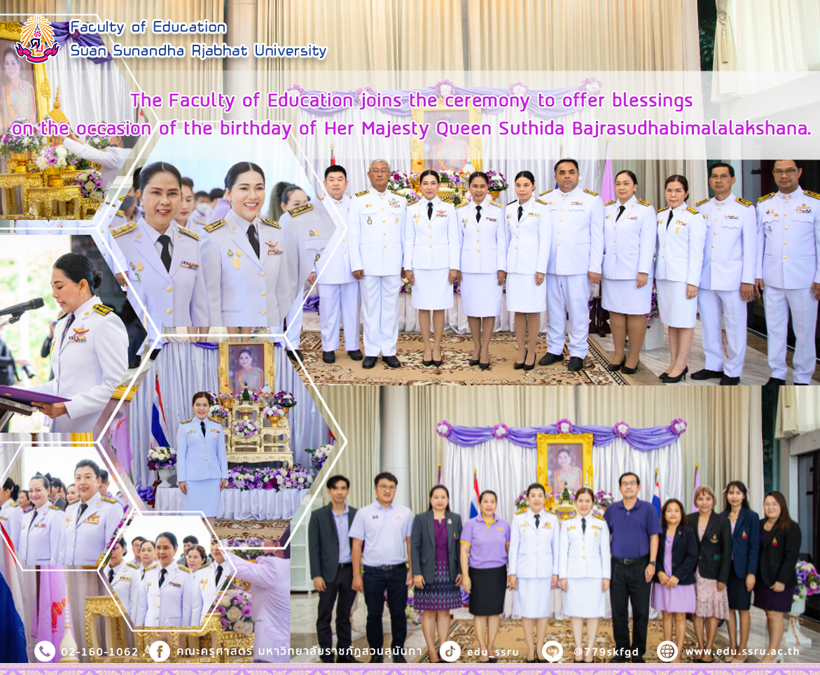 On May 30, 2024, at 08.30, the Faculty of Education, Suan Sunandha Rajabhat University, led by Assistant Professor Dr. Kannika Phiromrat, Dean of the Faculty of Education, along with Assistant Professor Dr.Boonrudee Udomphol, Deputy Dean for Planning and Quality Assurance, Weerapojt Ruttanawarn, Deputy Dean for Administration, and personnel, attended the ceremony to offer blessings on the occasion of Her Majesty Queen Suthida Bajrasudhabimalalakshana's birthday, chaired by Associate Professor Dr. Chutikarn Srivibul, President of Suan Sunandha Rajabhat University, along with executives, lecturers, students, and students at the Hall of Fame, 1st floor, Office of the President Building.