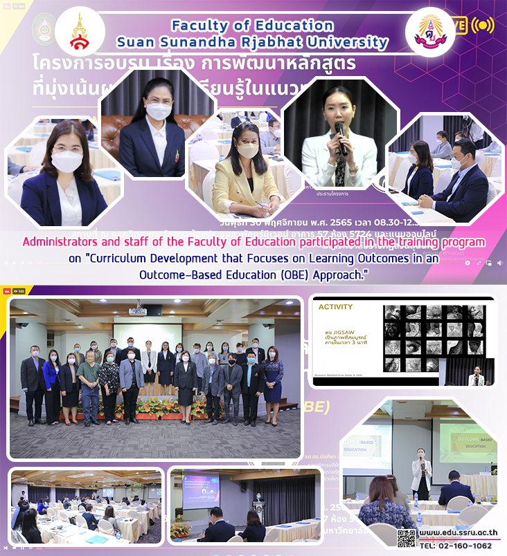 On November 30, 2022, from 8:30 a.m. to 12:30 p.m., the Faculty of Education at Suan Sunandha Rajabhat University, led by Assistant Professor Dr. Kannika Piromrat, Dean of the Faculty of Education, together with personnel in the faculty, participated in the training project on "Curriculum Development that Focuses on Learning Outcomes in an Outcome-Based Education (OBE)" approach with Associate Professor Dr. Nantiya Noichan, Vice President for Academic Affairs, as the project'spresided over the opening speech of the project with Assistant Professor Dr. Supawan Sajjapibul, a lecturer from the Faculty of Education. Srinakharinwirot University as a lecturer in training at the Faculty of Management Sciences Suwapak Niwet Conference Room, Building 57, Room 5724, and online via Facebook Live.