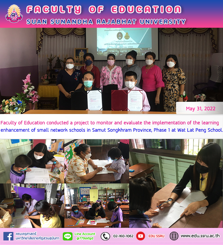 Dr.Teeraporn Plailek, Associate Dean for Research and Academic Services Persons in charge of the project, along with Ajarn Panuwat Sivasakulrat, Head of Teacher Professions Group, Ajarn Nattaka Sutthitanakul, Ajarn Kultraporn Suphong, Ajarn Piengruethai Puttikhunkasem, Ajarn Sutthiphon Tanthong, a lecturer in the Faculty of Education. Conducted a project to monitor and evaluate the implementation of the learning enhancement of small network schools in Samut Songkhram Province, Phase 1, with honor from Director of Wat Lad Peng School gave a special lecture on “The Importance of Developing Reading and Writing Skills and Moral Ethics of Elementary School Students” and the Operations Group. Discussion in the morning on “Effects of using educational innovations to promote morality and ethics of students” and discussion in the afternoon on “Promoting morality and ethics of elementary school students” on May 31, 2022 at Wat Lad Peng School.
