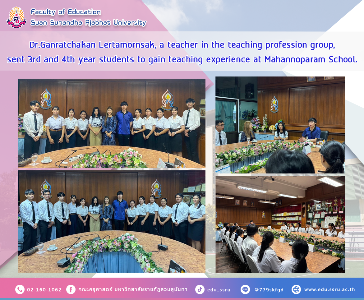 On May 31, 2024, Dr.Ganratchakan Lertamornsak, a lecturer in the Teacher Professional Group, Faculty of Education, Suan Sunandha Rajabhat University, sent third- and fourth-year students to practice teaching at Mahannoparam School.