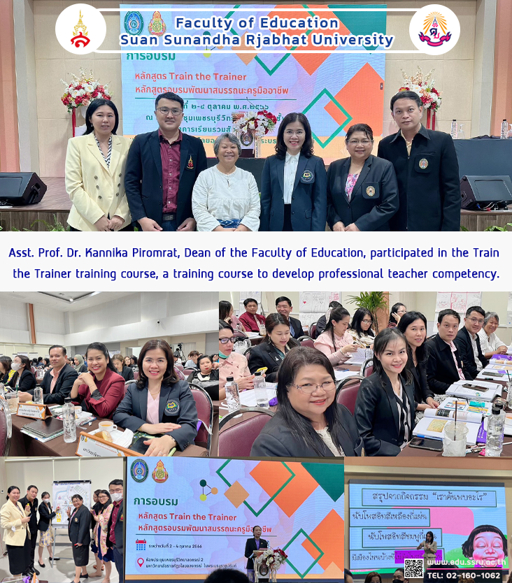 October 2-4, 2023, Faculty of Education, Suan Sunandha Rajabhat University, led by Assistant Professor Dr. Kannika Piromrat, Dean of the Faculty of Education. Assistant Professor Dr. Tasanee Satthaphong, Deputy Dean for Academic Affairs, Lecturer Dr. Patcharaporn Pilasombat, Chair of the Graduate Program Assistant Professor Panuwat Sivaskunraj, Head of the Teaching Profession Group Assistant Professor Dr.Thanatyod Jampawai, Head of the Department of Mathematics Assistant Professor Dr. Sommai Pawabut, Assistant Professor Sirimanee Banjong, and Assistant Professor Dr.Sasiporn Phongploenpis attended the Train the Trainer training course and professional teacher competency development training course at the Phetchaburi Witthaya Longkorn conference room. 2 Valaya Alongkorn Rajabhat University under royal patronage
