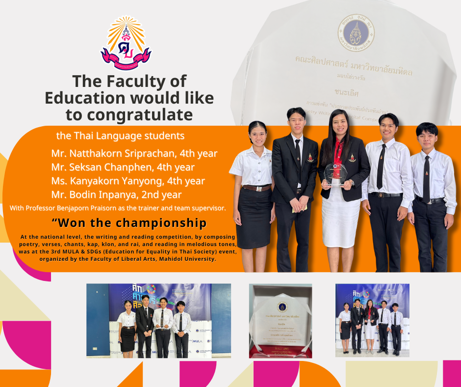 The Faculty of Education, Suan Sunandha Rajabhat University, would like to congratulate Mr. Natthakorn Sriprachan, 4th year; Mr. Seksan Chanphen, 4th year; Ms. Kanyakorn Yanyong, 2nd year; and Mr. Bodin Inpanya, 2nd year, of the Thai Language Department, who won first place in the national tertiary-level poetry reading competition by composing poetry, including Khlong, Chan, Kap, Klon, and Rai, and reading in melodious tones at the 3rd MULA & SDGs (Education for Equality in Thai Society) competition, organized by the Faculty of Liberal Arts, Mahidol University. They received a trophy and 5,000 baht in prize money. The team was trained and supervised by Benjaporn Praisorn.
