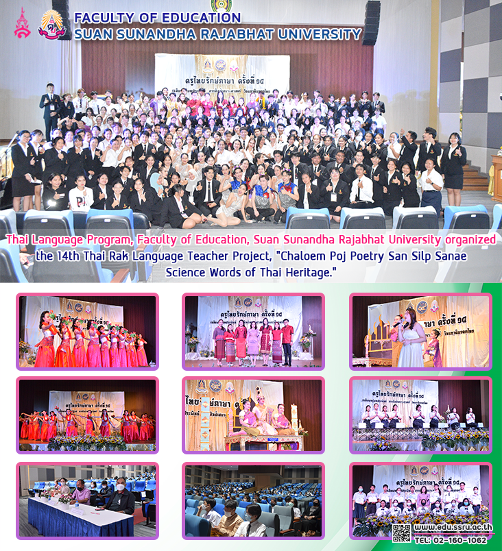On January 28, 2023, the Thai language branch of the Faculty of Education at Suan Sunandha Rajabhat University organized the 14th Thai Rak Language Teacher Project, "Chaloem Poj Poetry San Silp Sanae Science Wajjanachart Thai Heritage," and gave awards to the winners of the essay and calligraphy competitions and the improvised competitions, reciting melody and chanting "Oh Eh Wihan Rai" in the final round at Sunanthanusorn Auditorium.