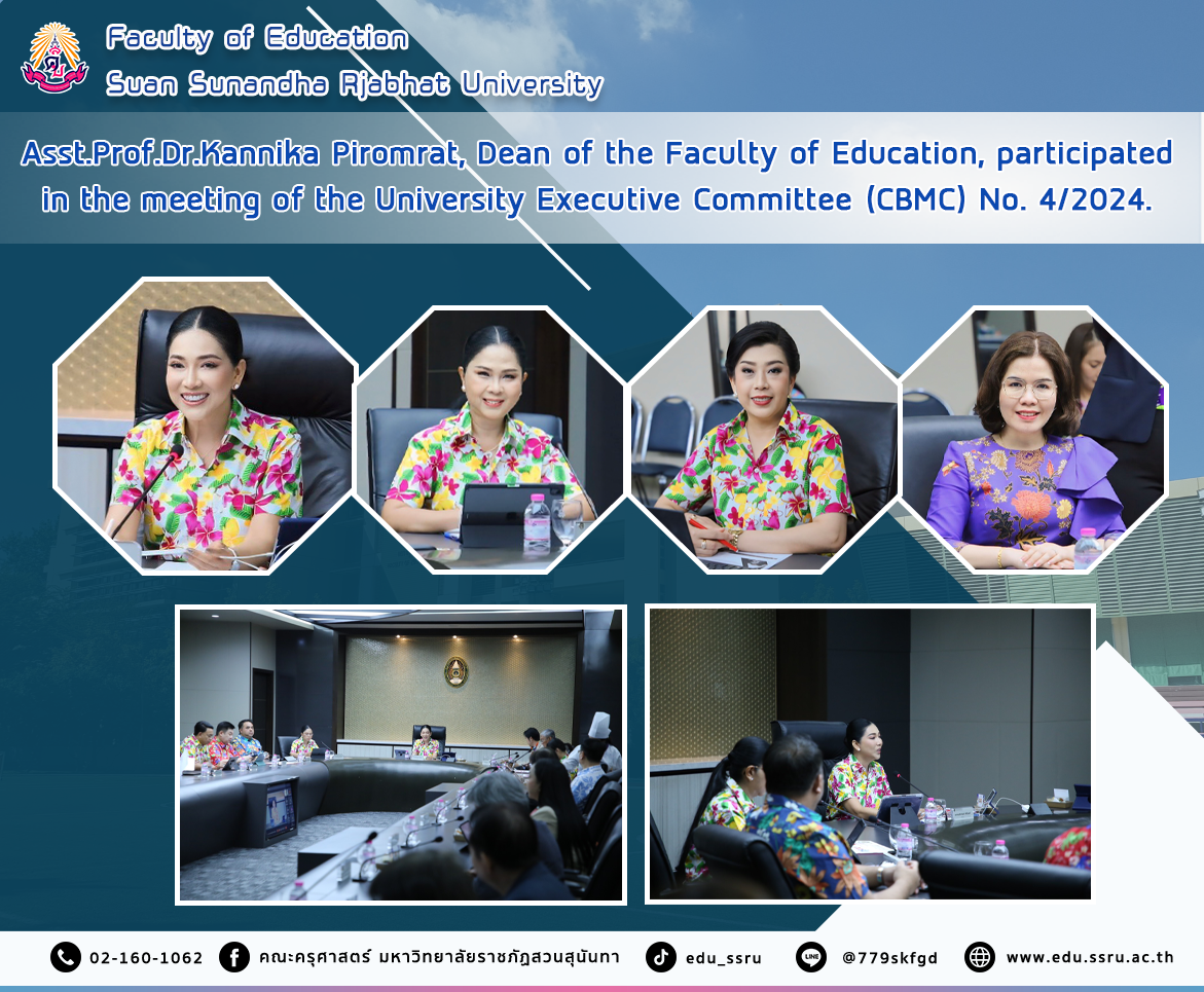 On April 4, 2024, Assistant Professor Dr. Kannika Piromrat, Dean of the Faculty of Education, and Associate Professor Dr. Sumalee Thianthongdee, Assistant Rector for Academic Affairs at Suan Sunandha Rajabhat University, participated in the meeting of the Executive Committee of Suan Sunandha Rajabhat University (K.B.M.) No. 4/2024. Associate Professor Dr. Chutikarn Sriwiboon, President of Suan Sunandha Rajabhat University, chaired the meeting at the University Council meeting room, Building 31, 5th floor.