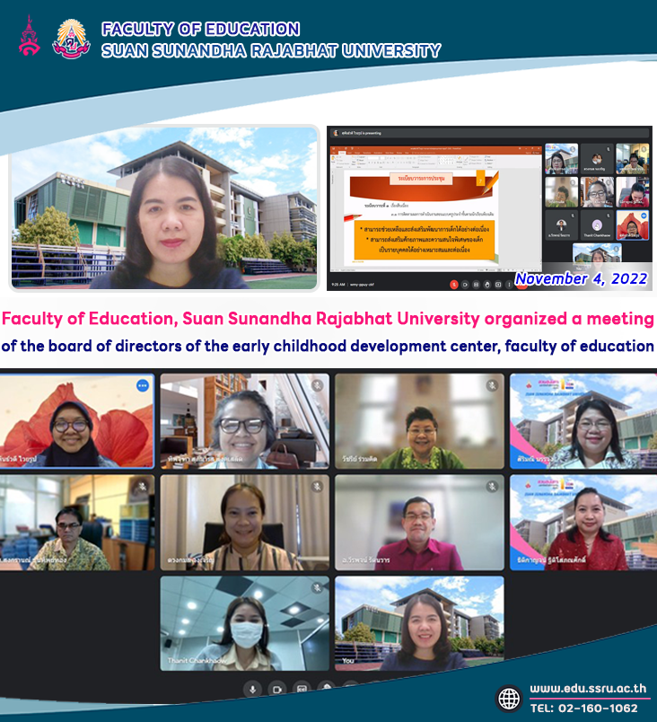 Friday, November 4, 2022, at 9:00 a.m. Faculty of Education, Suan Sunandha Rajabhat University, led by Assistant Professor Dr. Kannika Piromrat, Dean of the Faculty of Education. Weerapojt Ruttanawarn, Associate Dean for Administration, Assistant Professor Songkran Khuntiptong, Associate Dean for Student Affairs, Lecturer Dr. Duangkamol Chongcharoen, Director of the Center for Educational Vocational Development, Assistant Professor Suphanwadee Waiyaroop, Director of the Early Childhood Development Center Thitikan Thitisophonsak, Head of Early Childhood Education, and teachers in the Department of Early Childhood Education organized a meeting of the Board of Directors of the Early Childhood Development Center, Faculty of Education. Through the online system Google Meet, teachers can clarify and follow up on teaching results.