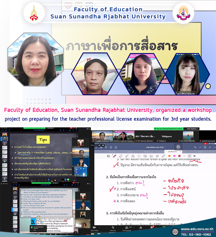 On December 3–4, 2022, from 8:30 a.m. to 4:00 p.m., the Faculty of Education, Suan Sunandha Rajabhat University, will be led by Panuwat Sivaskunraj, teacher of the Teacher Profession Group. organized a workshop project for third-year students on preparing for the teacher license examination on the use of English for communication and Thai language for communication by being honored by Assistant Professor Dr. Kannika Piromrat, the Dean of the Faculty of Education presided over the opening speech of the project. Ajarn Dr.Pintipa Suebsang, a lecturer in the English Program, and Dr.Siriorn Jullasap Kaewmoragot, a lecturer in the Thai Language Program as a lecturer in the training via online Zoom meetings.