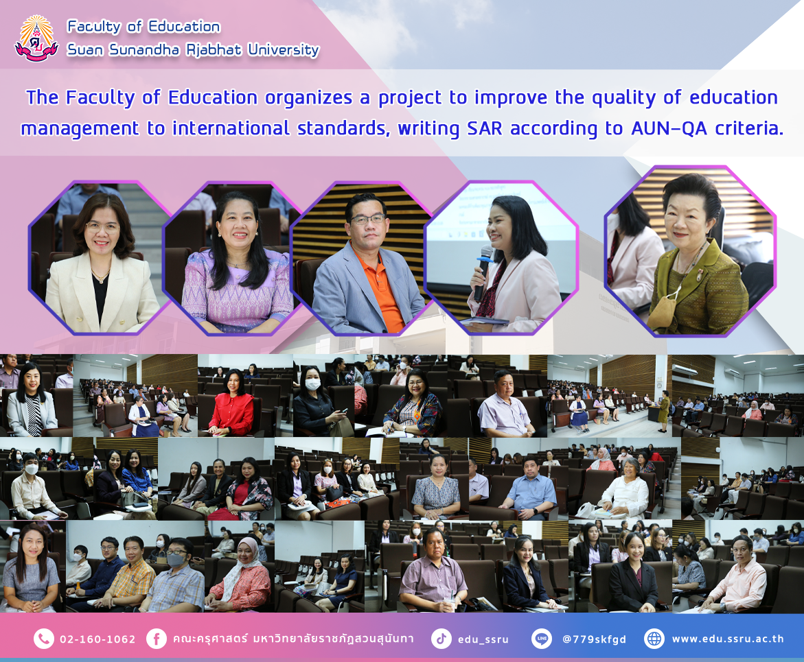 On June 6, 2024, from 9:00 a.m. to 4:00 p.m., the Faculty of Education organized a project to upgrade the quality of education management to international standards, writing SAR according to the AUN-QA criteria, with Assistant Professor Dr. Kannika Phiromrat, Dean of the Faculty of Education, giving an opening speech and being honored by Associate Professor Dr. Noanthip Kamonwarin, Deputy Dean for Educational Quality Development, Prince of Chulabhorn College of Medical Sciences, as a speaker in the lecture at Room 1137.