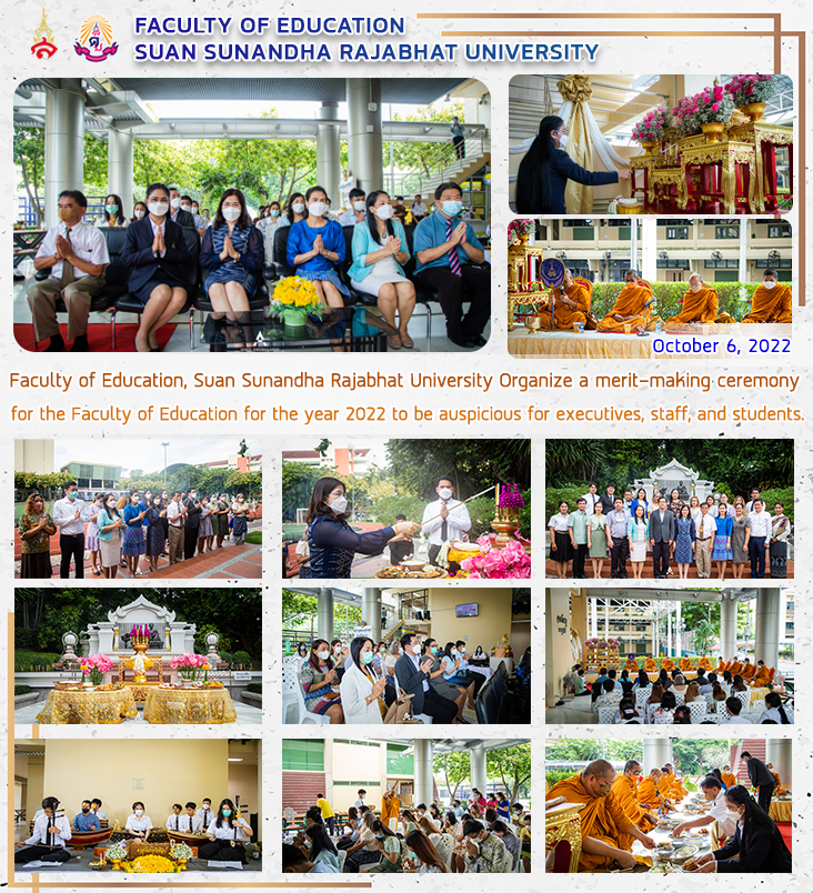 Wednesday, October 5, 2022, Faculty of Education, Suan Sunandha Rajabhat University, led by Assistant Professor Dr. Kannika Piromrat, Dean of the Faculty of Education, together with Associate Deans for all departments The head of the office, staff, faculty, and students organized a merit-making project for the Faculty of Education for the year 2022 to be auspicious for administrators, staff, and students, with monks from Rajathiwat Vihara Temple and Associate Professor Dr. Nantiya Noichun, Vice President for Academic Affairs. presided over the offering of garlands, lighting incense and candles to worship the Three Jewels and offering a set of monks To all 9 monks at Kru's house, Faculty of Education, Suan Sunandha Rajabhat University