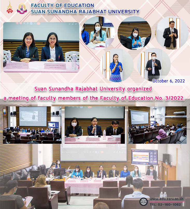Wednesday, October 5, 2022, Faculty of Education, Suan Sunandha Rajabhat University, led by Assistant Professor Dr. Kannika Piromrat, Dean, together with Associate Deans from all parties. Organize the meeting of the Faculty of Education No. 3/2022 to inform the various agendas Let the faculty know and report the results of the various vice deans for fiscal year 2022 at room 1137 and via the online system Google Meet.