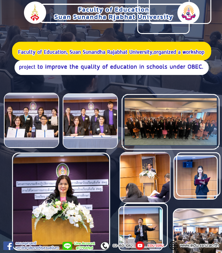 On November 4, 2023, the Faculty of Education at Suan Sunandha Rajabhat University organized a project to organize a workshop to raise the quality of education in schools under OBEC, Border Patrol Police schools, and Education Fund schools, with Assistant Professor Dr. Kannika. Bhiromrat, Dean of the Faculty of Education, presided over the opening speech of the training program. and received honors from Assistant Professor Dr. Suttipong Boonphadung, who was a lecturer at the Royal River Hotel. Bangkok