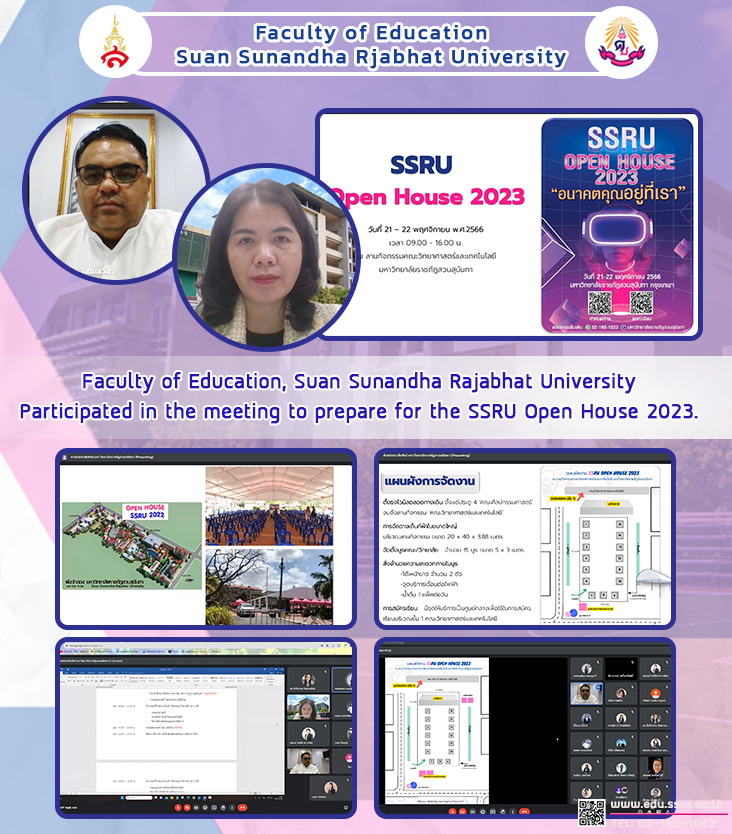 November 6, 2023, at 1:30 p.m., Faculty of Education, Suan Sunan Rajabhat University, led by Assistant Professor Dr. Kannika Piromrat, Dean of the Faculty of Education. Assistant Professor Dr. Tasanee Setthaphong, Deputy Dean for Academic Affairs, and Professor Weerapoj Rattanawat, Deputy Dean for Administration I participated in a meeting to prepare for SSRU Open House 2023 via the online Google Meet system with Assistant Professor Dr. Khomsan Somonawat, Vice President for Administration. Chairing the meeting