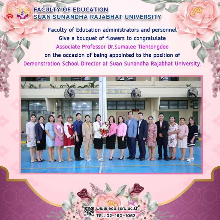 On May 7, 2024, Assistant Professor Dr. Kannika Piromrat, Dean of the Faculty of Education at Suan Sunandha Rajabhat University, along with administrators and personnel of the faculty, gave a bouquet of flowers to congratulate Associate Professor Dr.Sumalee Tientongdee on the occasion of being appointed to the position of Demonstration School Director at Suan Sunandha Rajabhat University.