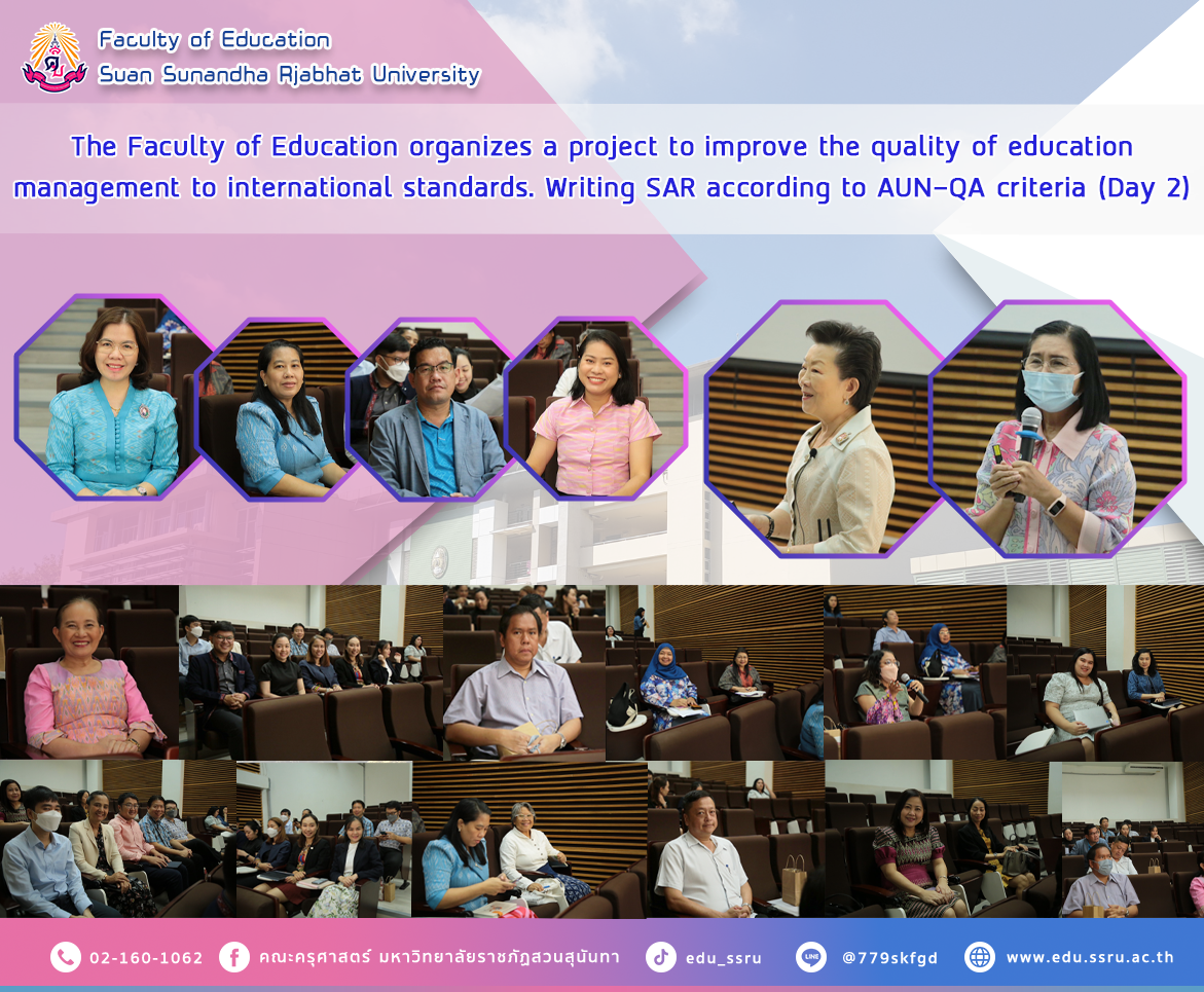 On June 7, 2024, from 9:00 a.m. to 4:00 p.m., the Faculty of Education at Suan Sunandha Rajabhat University organized a project to upgrade the quality of education management to international standards by writing SAR according to the AUN-QA criteria. We were honored by Associate Professor Dr. Noanthip Kamonwarin, Deputy Dean for Educational Quality Development, Prince of Chulabhorn College of Medical Sciences, Assistant Professor Dr. Anchalee Saiyawan, and Assistant Professor Dr. Boonrudee Udomphol as speakers in the lecture at Room 1137.